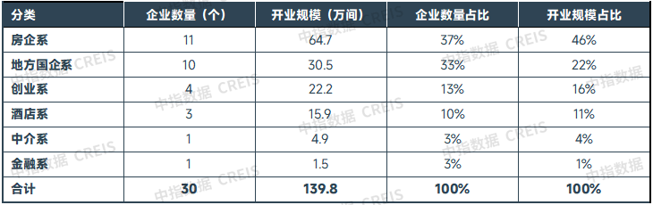 其中,房企系开业规模领先优势突出,合计占比达46%;地方国企系开业规模持续增长,合计占比超20%;创业系、酒店系开业规模占比也均在10%以上。