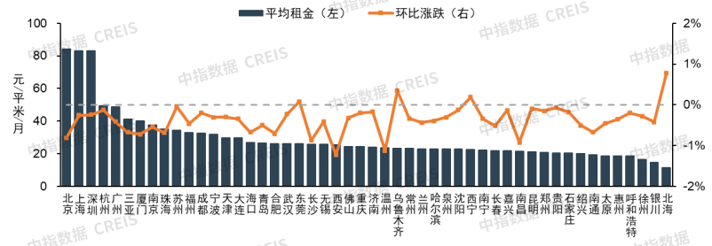 图:2025年9月50个城市住宅平均租金及环比涨跌