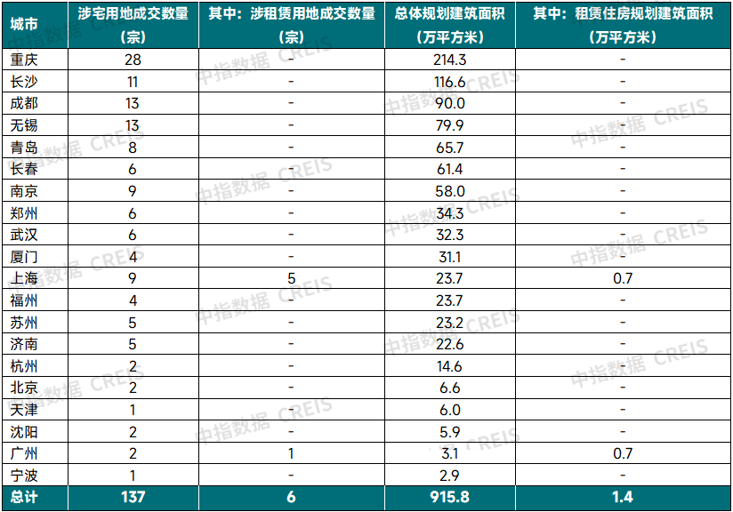 9月重点22城中共成交6宗涉租用地,合计1.4万平方米。其中,广州成交一宗小体量全自持保租房用地,规划建筑面积7486平方米;上海2025年第七批次土拍中,5宗住宅用地需配建5%的公租房,租赁住房用地规划建筑面积合计6932平方米。