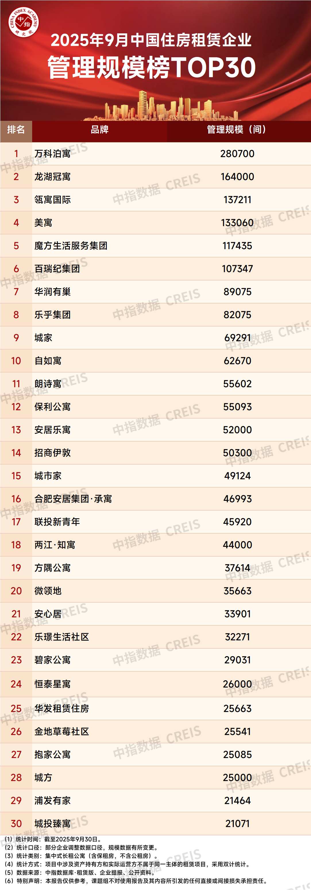 据中指研究院统计,2025年9月,TOP30集中式长租公寓企业累计管理房源量约198万间,入榜门槛为21071间。