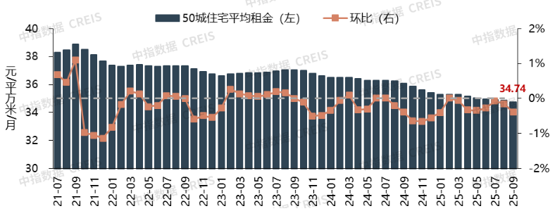 图:2021年7月至2025年9月50城住宅平均租金及环比涨跌